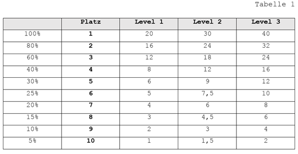 Punkteschlüssel zur Darstellung der Leistung eines Teams, der zur Erstellung der Ergebnisliste herangezogen wird.